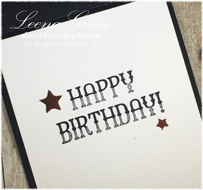 The stamped image is from the coordinating Birthday Blast stamp set (available as a discounted bundle with the dies!). I stamped in Basic Black ink on Whisper White card stock. I added some copper metallic thread along the lower edge of the panel as well as some of the stars that were cut out with the upper piece.