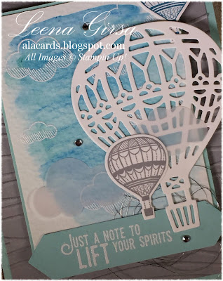 On the inside, I added a Whisper White panel on which I stamped the sentiment, from the Lift Me Up stamp set in Island Indigo ink, a balloon in Pool Party and some clouds in Smoky Slate (stamped off once),.