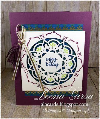 I think this may have been inspired by Pinterest, but it has been a while since I designed it so I can't remember exactly whose card it was. I used some Succulent Garden DSP for the background panel, mounting it on a larger piece of Whisper White card stock. I layered that on a piece of Mint Macaron card stock embossed using the Petal Burst TIEF. The wreath is die-cut using the Swirly Scribbles thinlits and the flower is done with the Succulent Framelits. I use Mint Macaron and silver glimmer paper to construct the flower.